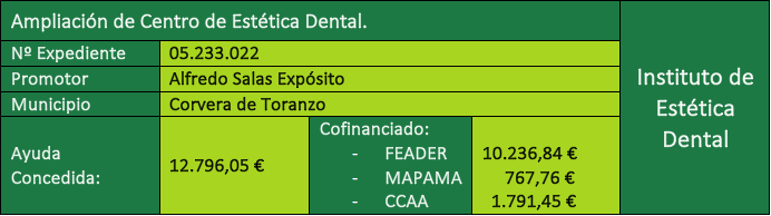 Con la subvención otorgada para tres de sus centros, se ha pretendido ampliar y modernizar sus clínicas dentales ubicadas en los Valles Pasiegos, ante la demanda creciente y la pretensión de ser más competitivos, en aras a un mejor rendimiento y una mayor eficacia en el trabajo.